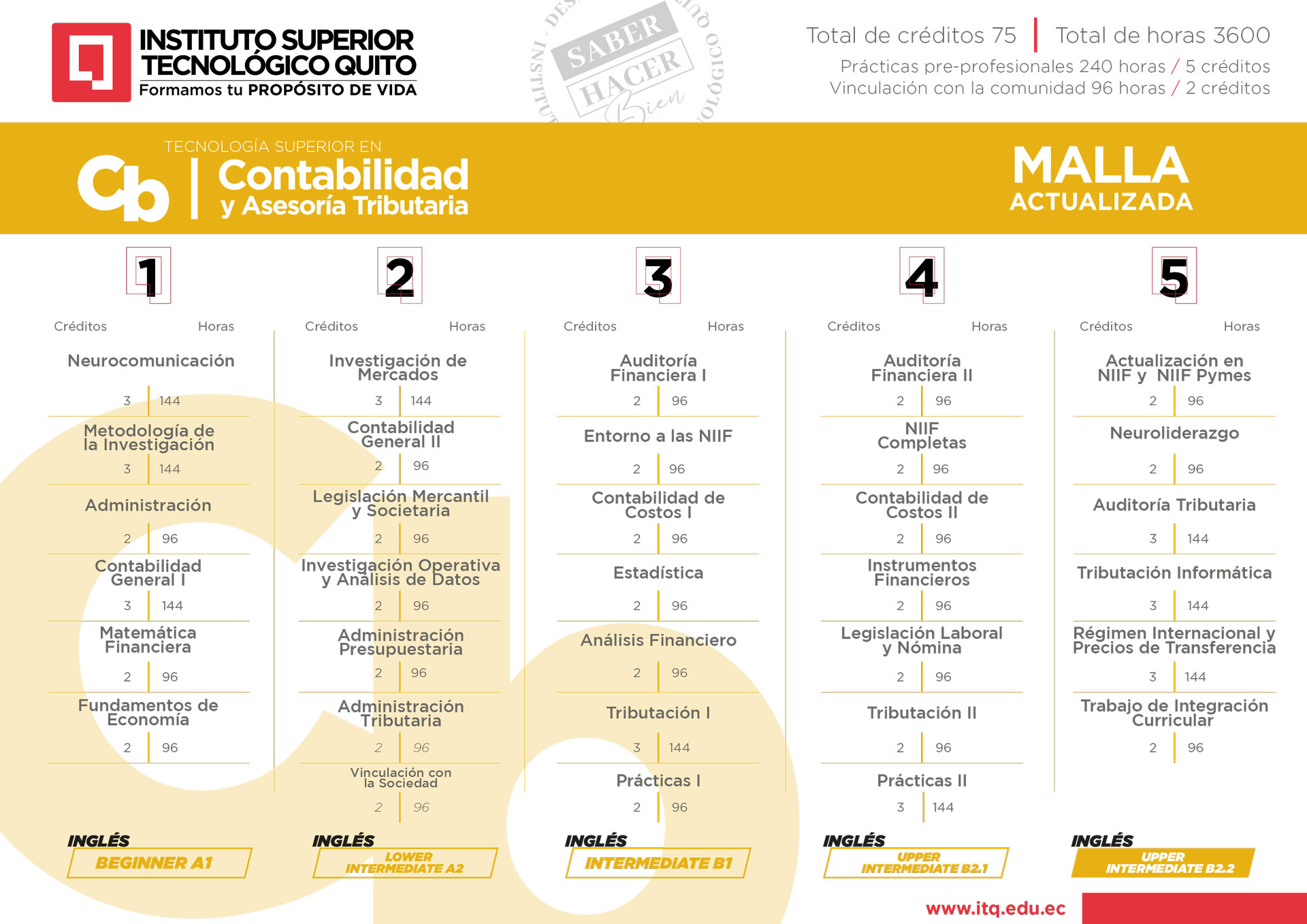 El Tecnólogo/a Superior en Contabilidad y Asesoría Tributaria cuentan con conocimientos de las diferentes teorías contables y tributarias, las mismas que le permiten realizar un análisis profundo de la situación contable y tributaria en el ámbito laboral, brindando asesoría profesional en impuestos y normativas vigentes del SRI, también el tecnólogo del Instituto Superior Tecnológico Quito domina la reportería contable y firma balances, de esta manera nuestros profesionales pueden tomar decisiones oportunas, adecuadas y precisas; manteniendo un sentido de responsabilidad social y ética.