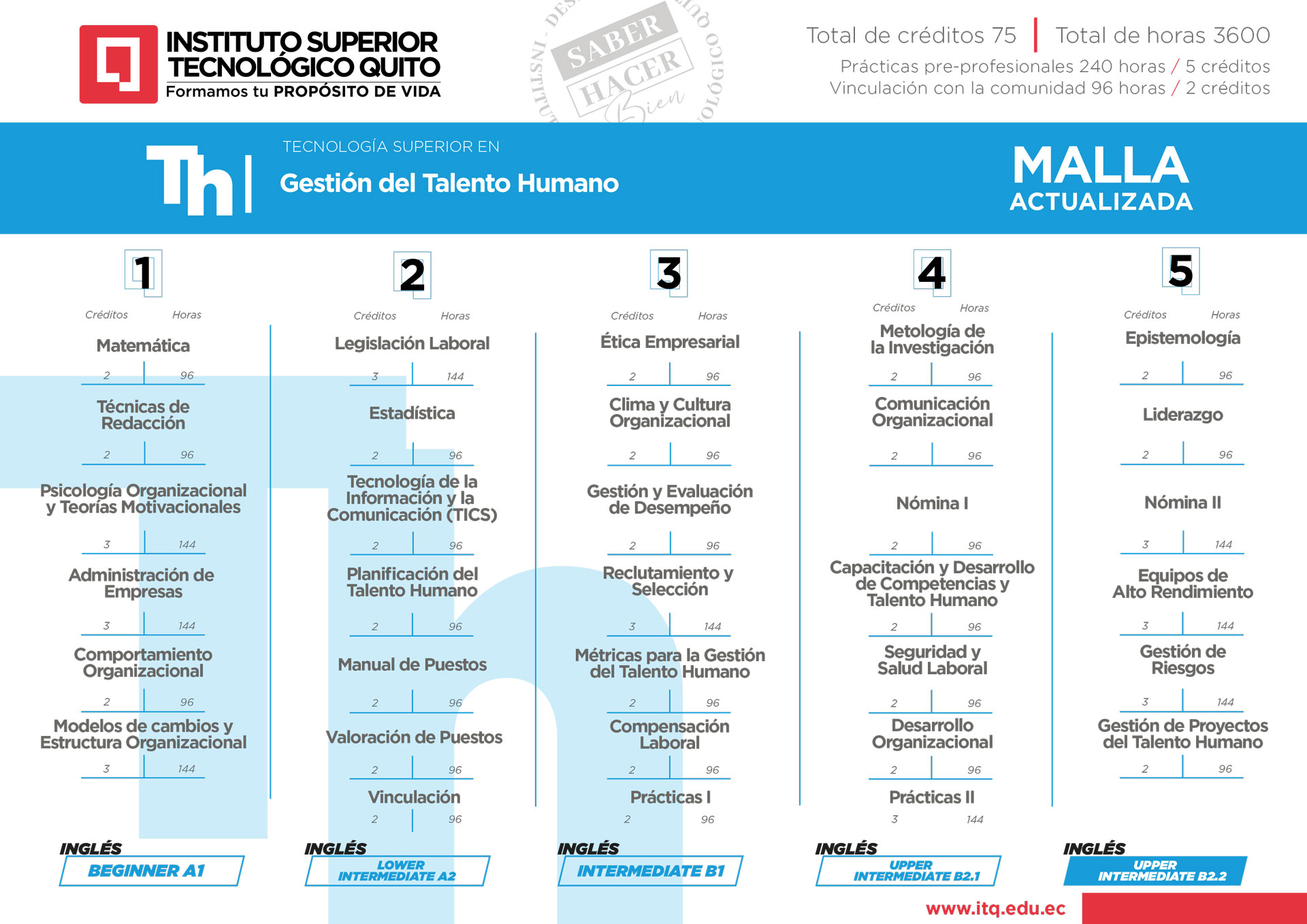 El Tecnólogo/a Superior en Gestión del Talento Humano puede desempeñarse en organizaciones del sector público y privado, administrando los recursos institucionales con el objetivo de optimizar la productividad y desempeño de los miembros, mediante el reclutamiento, evaluación y análisis de cargos para la ejecución de planes de desarrollo y capacitación para un buen clima laboral, así mismo los tecnólogos del Instituto Superior Tecnológico Quito son capaces de elaborar programas de higiene y seguridad industrial, planes, políticas y procedimiento que impacten en la organización.