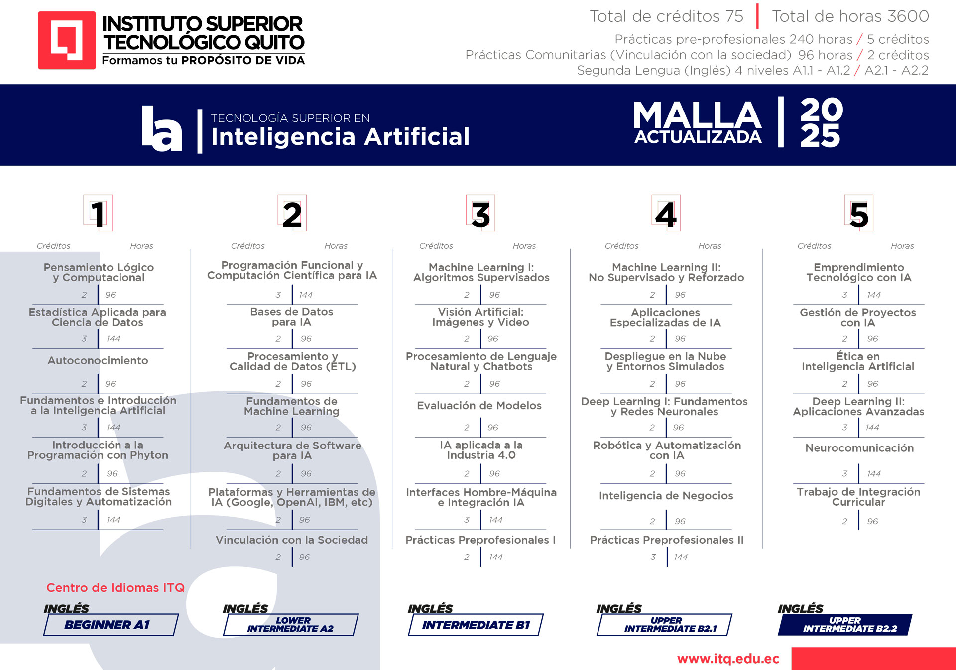 El Tecnólogo Superior en Inteligencia Artificial es capaz de diseñar, desarrollar e implementar soluciones inteligentes que respondan a las necesidades del entorno productivo y social. Posee competencias en modelos computacionales, programación, análisis de datos y aprendizaje profundo (Deep Learning), lo que le permite crear sistemas capaces de procesar información, aprender de ella y tomar decisiones de manera autónoma. Aplica técnicas avanzadas de automatización, visión computacional, procesamiento de lenguaje natural y robótica, integrando sensores, dispositivos IoT y herramientas de inteligencia artificial en diferentes sectores como la industria, salud, educación, logística, banca y servicios digitales.